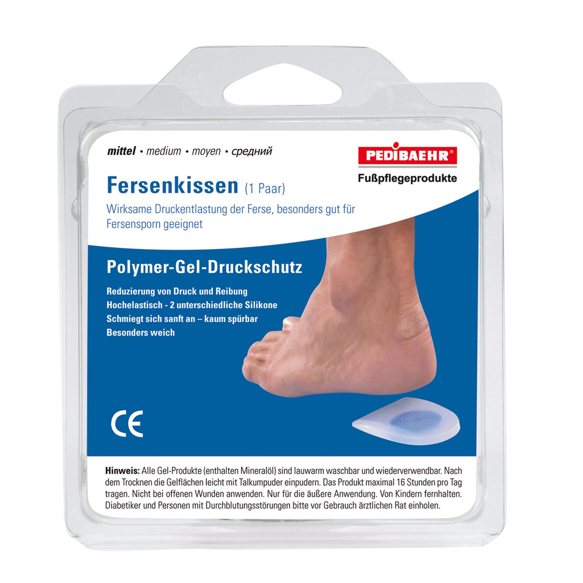 Die verschiedenen Arten dieses Druckschutzes zeichnen sich durch höchsten Tragekomfort aus, da sie aus einem weichen Polymer-Gel bestehen, das sich optimal den Fußkonturen anpasst und jegliches Fremdkörpergefühl vermeidet. Die feinstverteilten mineralischen Öle (Paraffinöl) in den Pedibaehr Gel-Fersenkissen schützen die Haut vor Austrocknung, reduzieren Verhornungen und halten sie weich und geschmeidig.